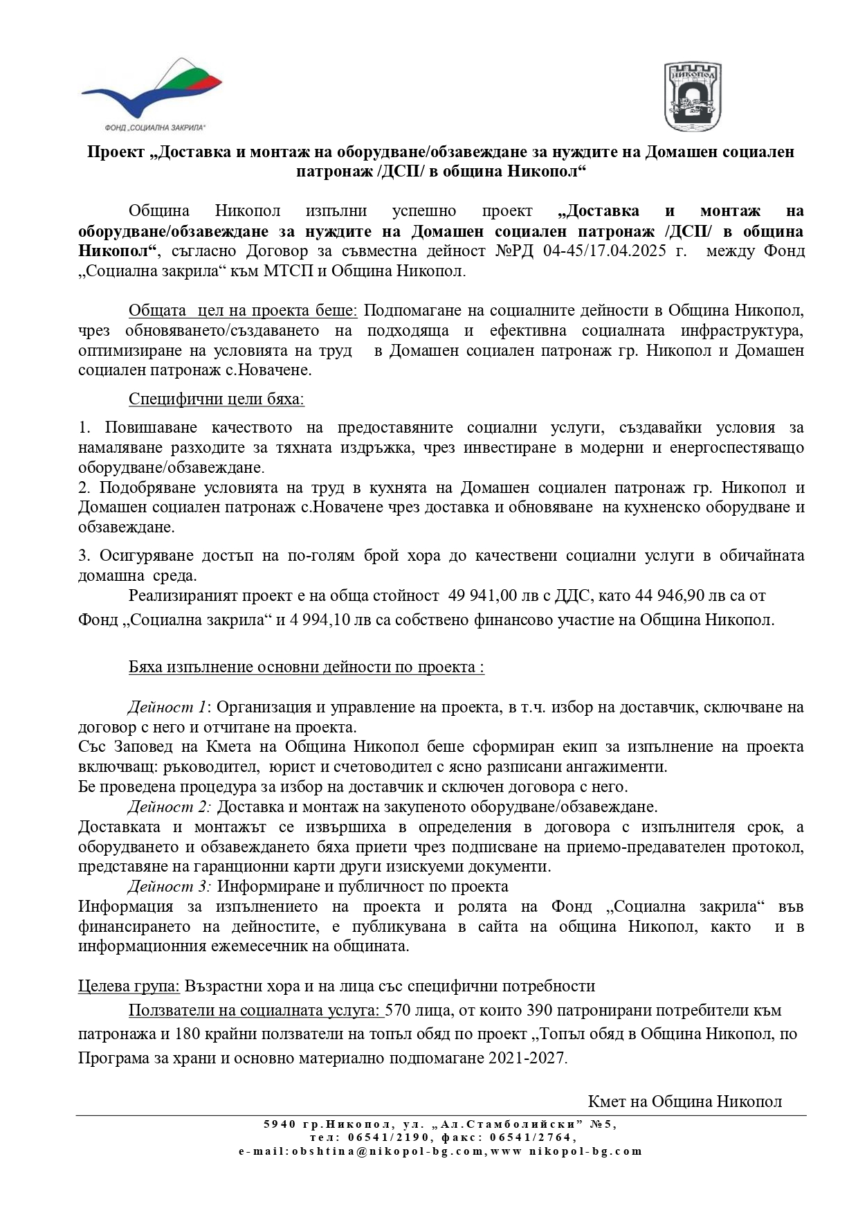 Проект „Доставка и монтаж на оборудване/обзавеждане за нуждите на Домашен социален патронаж /ДСП/ в община Никопол“
