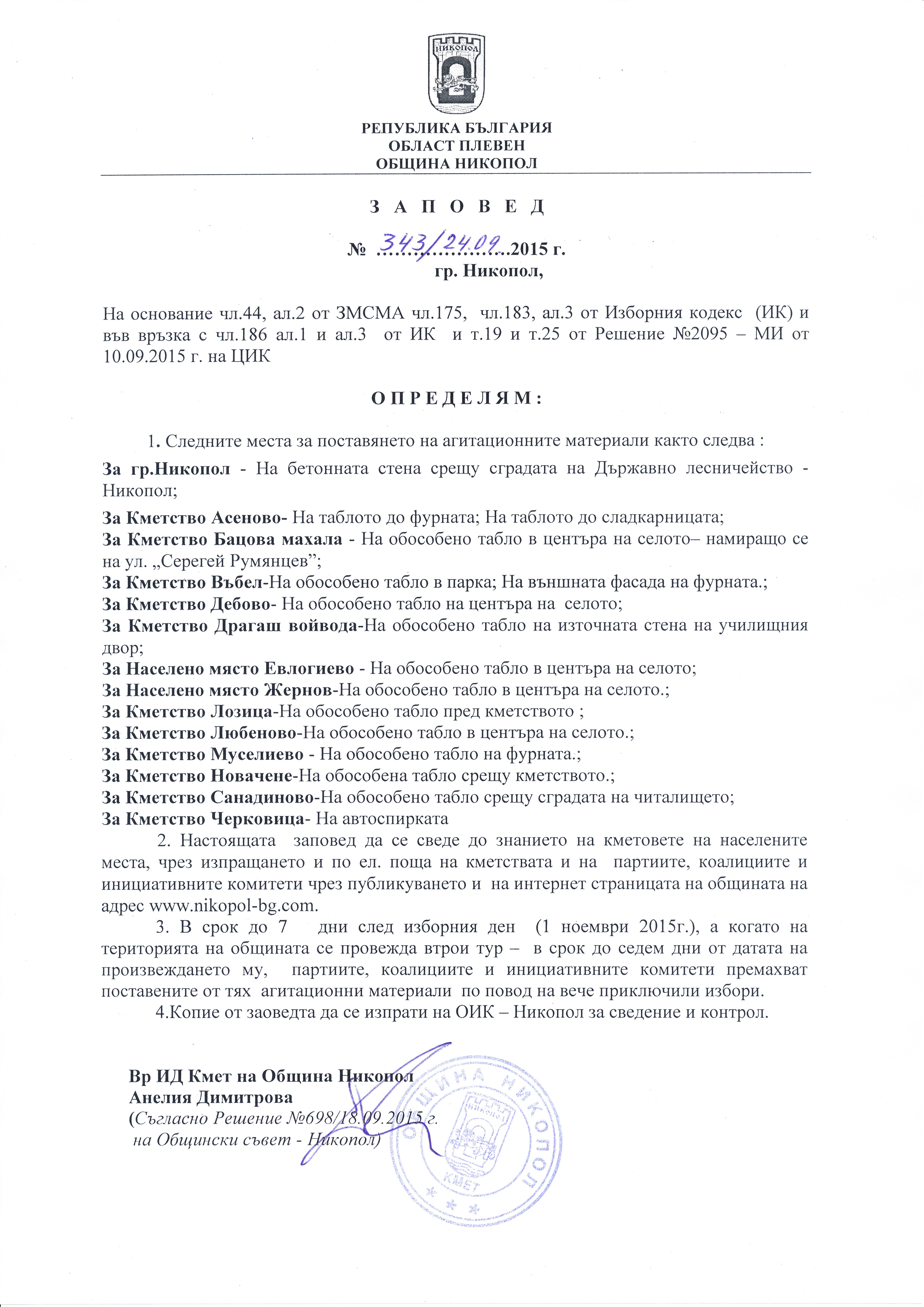 Заповед № 343/24.09.2015 г. относно определяне на местата за поставяне на агитационни материали