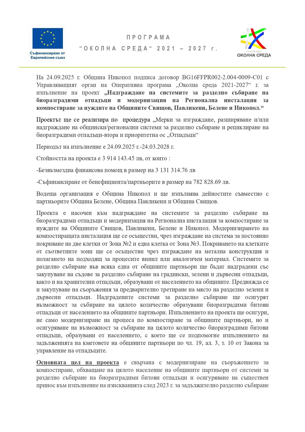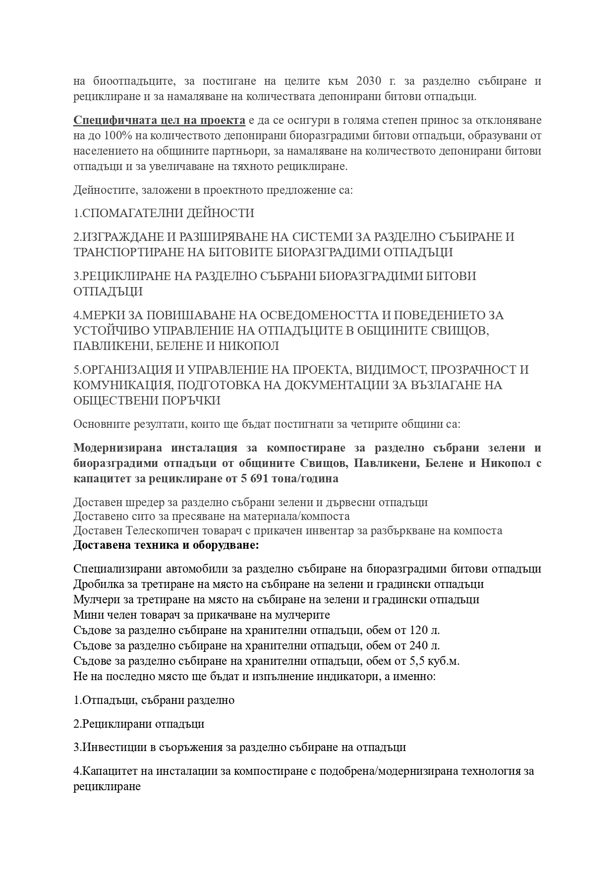 „Надграждане на системите за разделно събиране на биоразградими отпадъци и модернизация на Регионална инсталация за компостиране за нуждите на Общините Свищов, Павликени, Белене и Никопол.“