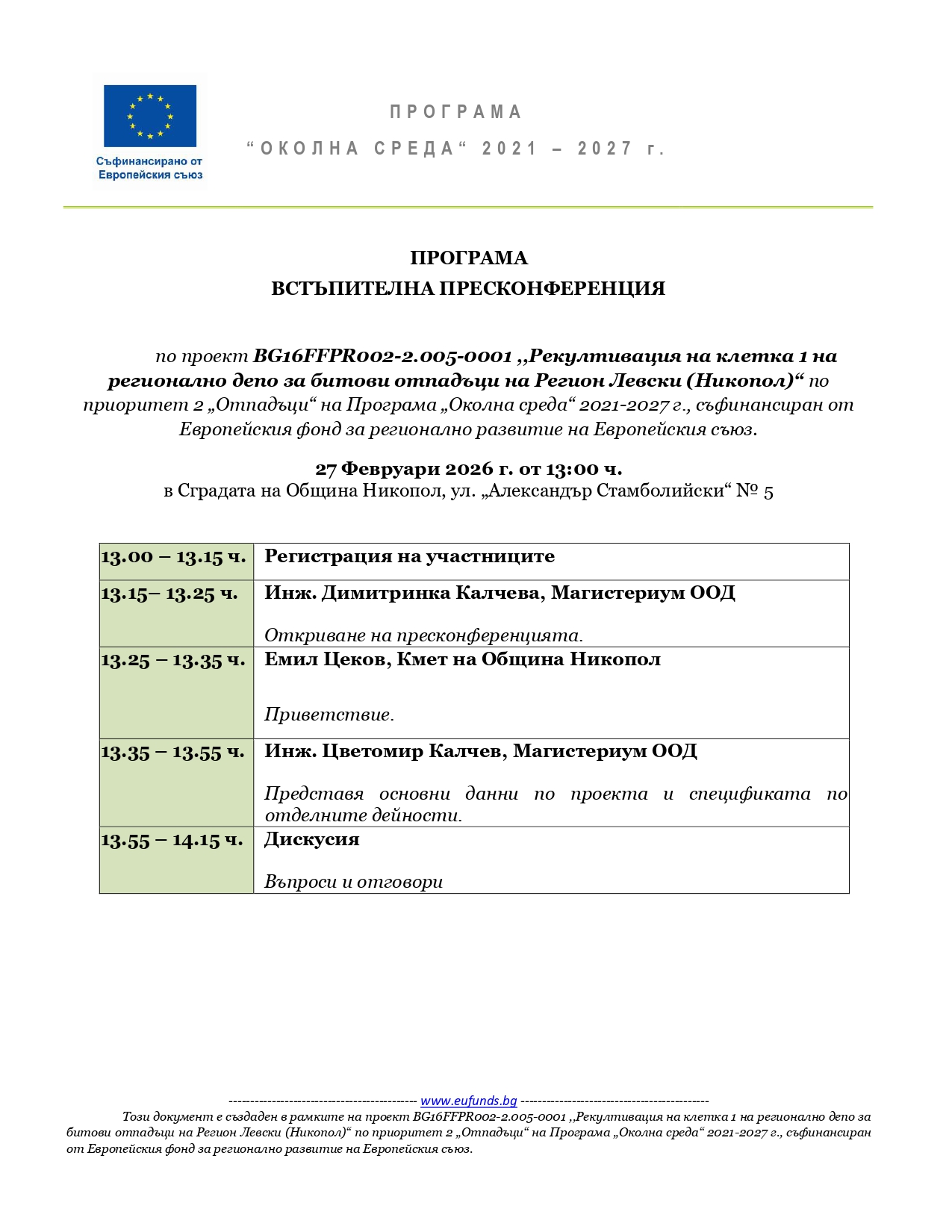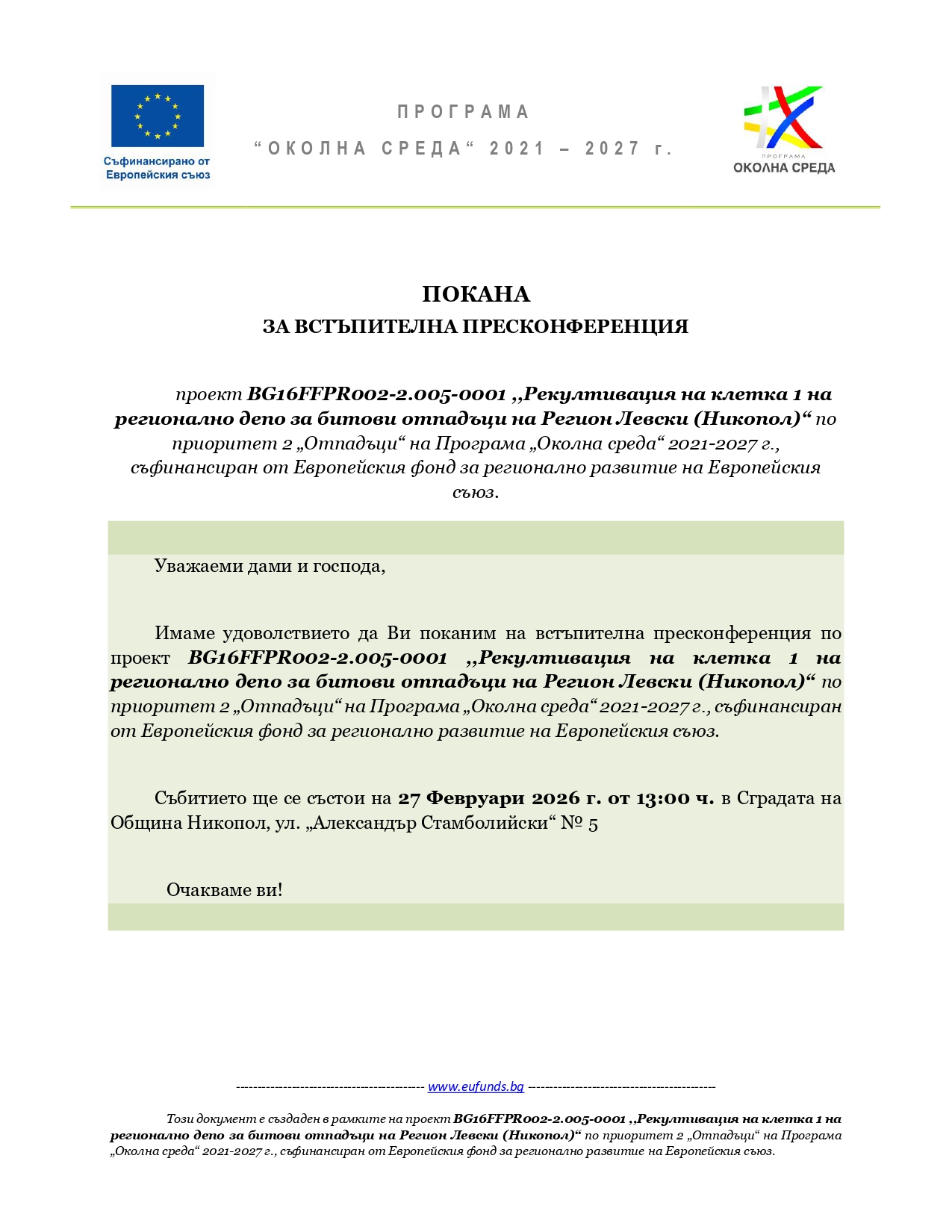 ,,Рекултивация на клетка 1 на регионално депо за битови отпадъци на Регион Левски (Никопол)“