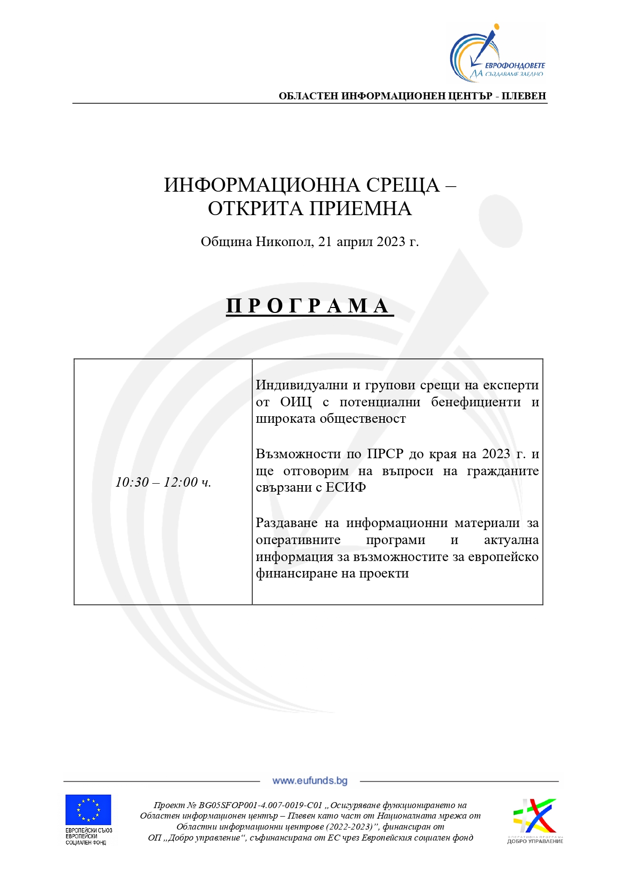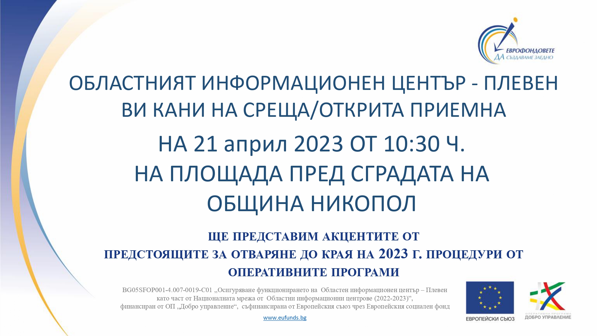 Областният Информационен център - Плевен Ви кани на среща/открита приемна на 21 Април 2023г. от 10:30 ч. на площада пред сградата на ОБЩИНА НИКОПОЛ