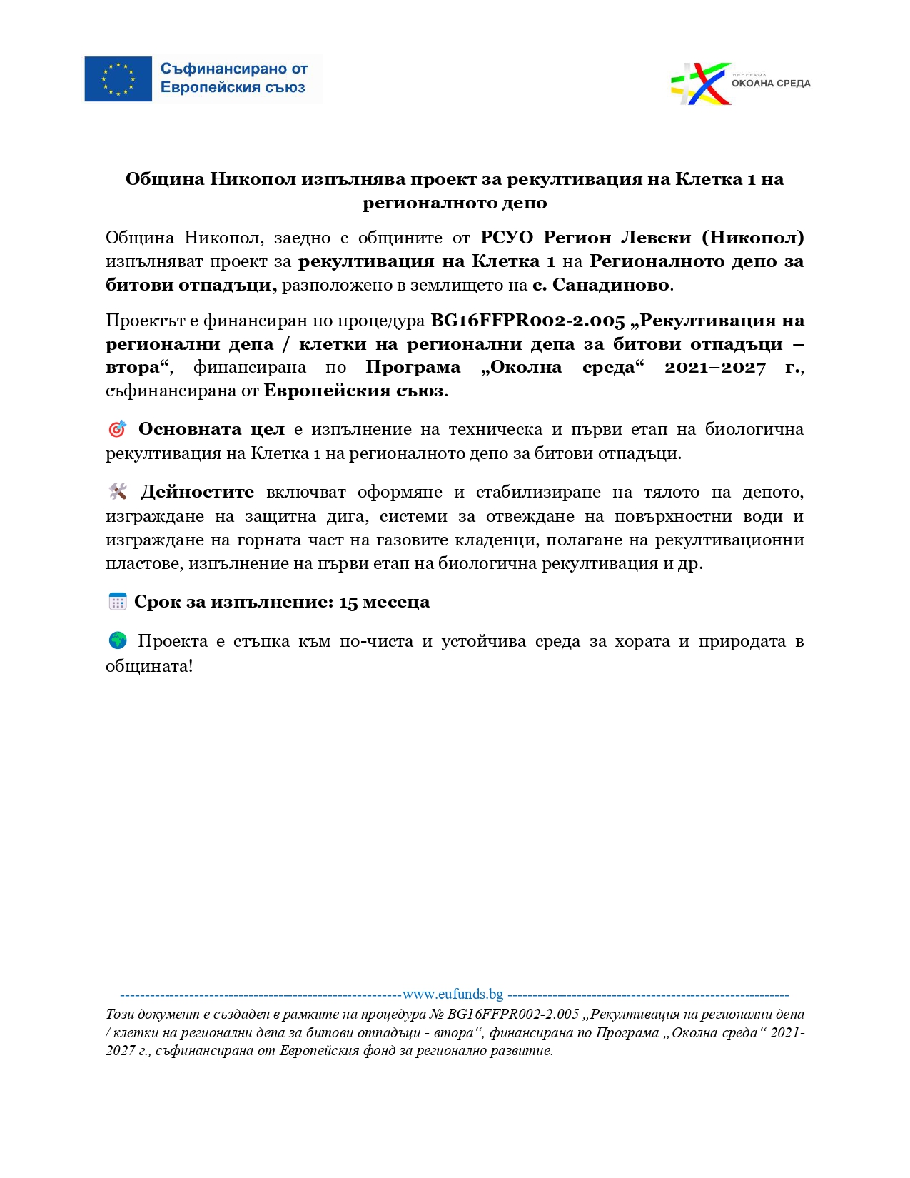 Община Никопол изпълнява проект за рекултивация на Клетка 1 на регионалното депо