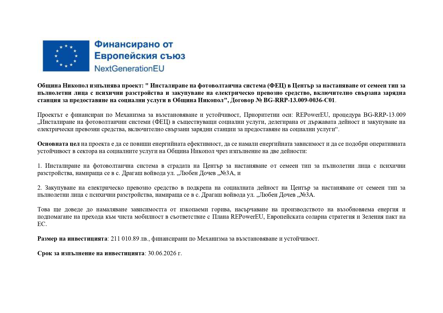 Община Никопол изпълнява проект: " Инсталиране на фотоволтаична система (ФЕЦ) в Център за настаняване от семеен тип за пълнолетни лица с психични разстройства и закупуване на електрическо превозно средство, включително свързана зарядна станция за предоставяне на социални услуги в Община Никопол", Договор № BG-RRP-13.009-0036-C01