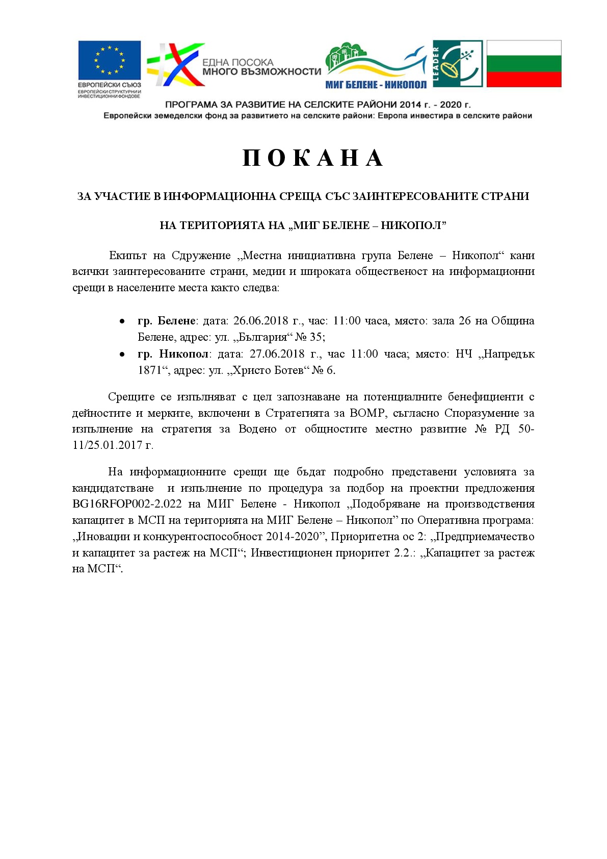 МЕСТНА ИНИЦИАТИВНА ГРУПА БЕЛЕНЕ - НИКОПОЛ Открива процедура за подбор на проектни предложения за предоставяне на безвъзмездна финансова помощ BG16RFOP002-2.022: МИГ БЕЛЕНЕ - НИКОПОЛ „Подобряване НА производствения капацитет в МСП на територията на МИГ БЕЛЕНЕ – НИКОПОЛ“